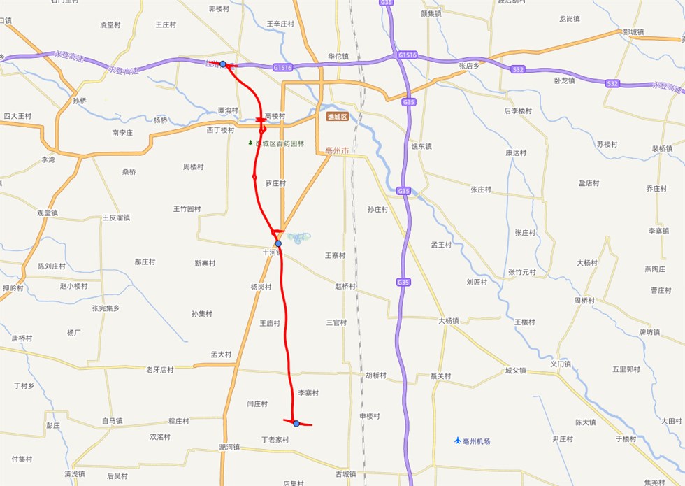项目起于亳州市谯城区魏岗镇西南侧与 G1516 盐洛高速交叉处,自北向南沿十八里镇东、亳州市中心城区西、十河镇东、双沟镇东,终点位于淝河镇东北侧与 S62亳郸高速交叉处。